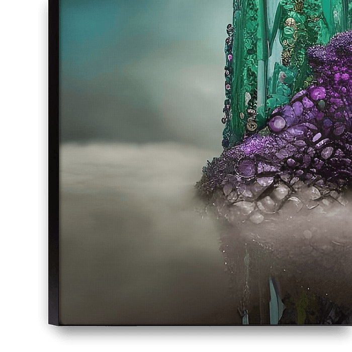 Digital AI Art von Christine aka stine1 mit Hilfe von Stable Diffusion. Eine Sinfonie aus Edelsteinen und Glas in Grün- und Pflaumentönen inmitten unseres Universums. Abstrakt und surreal, aber ätherisch und fesselnd!