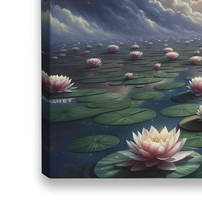 Das Bild entführt den Betrachter in eine Sphäre, wo die Grenzen zwischen Himmel und Wasser verschwimmen. Ein gewaltiger Mond beherrscht das Firmament, umgeben von einer Galaxie schillernder Planeten und Sternen. Unter ihm breitet sich ein stiller See aus, übersät mit Lotusblumen, deren Perfektion im sanften Glanz der kosmischen Lichter erstrahlt. Ein Koi, dessen Schuppen das Universum zu spiegeln scheinen, schwimmt durch dieses grenzenlose Nass, das sich in einem perfekten Spiegelbild am Himmel widerspiegelt. Die Szene ist ein meisterhaftes Spiel aus Licht und Farben, das die Schönheit des Kosmos und der Natur vereint und den Betrachter dazu einlädt, über die unendlichen Möglichkeiten der Existenz nachzusinnen.