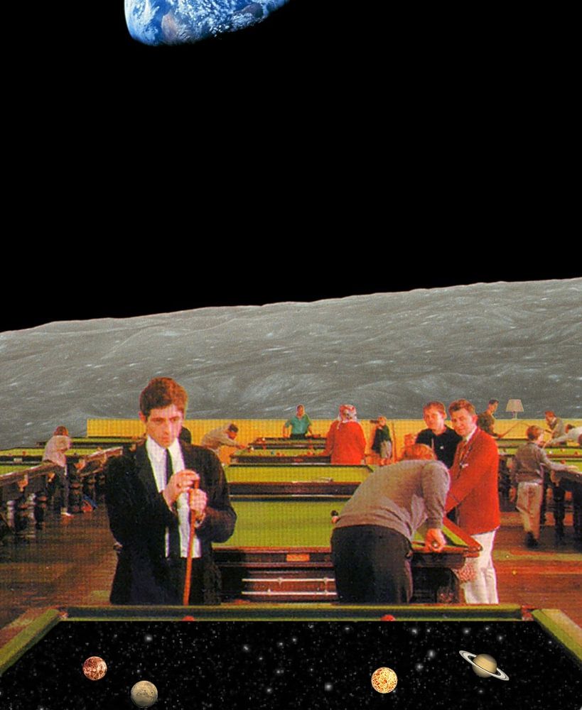 In 'Cosmic Games' sehen wir eine Gesellschaft, die vom Mond aus eine Partie "Pool" spielt. Sie spielen mit verschiedenen Planeten aus der Galaxie, während wir im Hintergrund unseren Heimatplaneten Erde sehen. Dieses fantasievolle Werk entstand aus meiner Liebe zum Universum, dessen Schönheit ich den Menschen näher bringen möchte. Ich möchte den Menschen seine Schönheit näher bringen. 'Cosmic Games' ist eine digitale Collage, die aus mehreren Schichten vorhandener Bilder besteht.