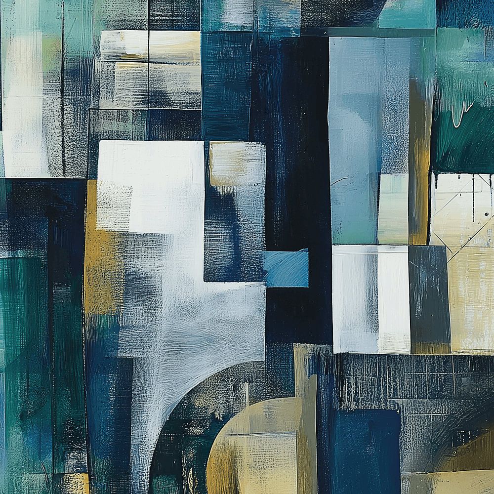 Dieses faszinierende abstrakte Gemälde kombiniert geometrische und architektonische Formen mit einer tiefen Farbpalette aus Nachtblau, Smaragdgrün, Gold und Weiß. Die Komposition spielt mit den Kontrasten zwischen Licht und Schatten und evoziert eine geheimnisvolle und kosmische Atmosphäre. Die klaren Linien und fließenden Farbübergänge verleihen dem Werk einen modernen und dynamischen Look, der sich perfekt für zeitgenössische Innenräume eignet. Dieses Kunstwerk spricht Liebhaber abstrakter Kunst an, die Komplexität und visuelle Tiefe lieben.