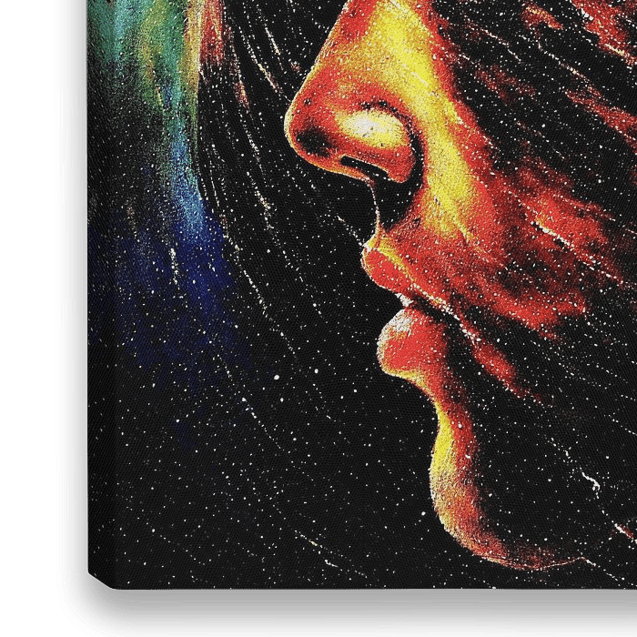 Dieses digitale Kunstwerk ist eine eindrucksvolle Verschmelzung von realistischer Porträtmalerei und surrealer, galaktischer Abstraktion. Im Zentrum steht das Profil eines menschlichen Gesichts, meisterhaft ausgearbeitet in warmen, erdigen Tönen, die eine tiefe emotionale Resonanz erzeugen. Die Gesichtszüge sind realistisch und fein…