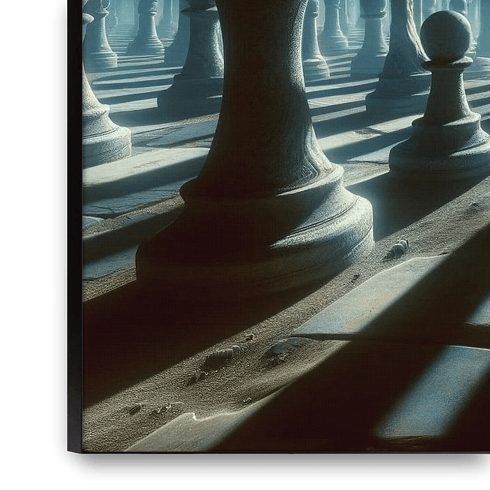 Dieses Kunstwerk präsentiert eine surreale Szene, in der die Intelligenz des Schachspiels mit der Unendlichkeit des Universums verschmilzt. Ein gewaltiges Schachbrett erstreckt sich bis zum Horizont, flankiert von den Silhouetten der Spielsteine, die sich im kühlen, bläulichen Schimmer eines Sternenlichts abzeichnen. Jede Figur, ob…