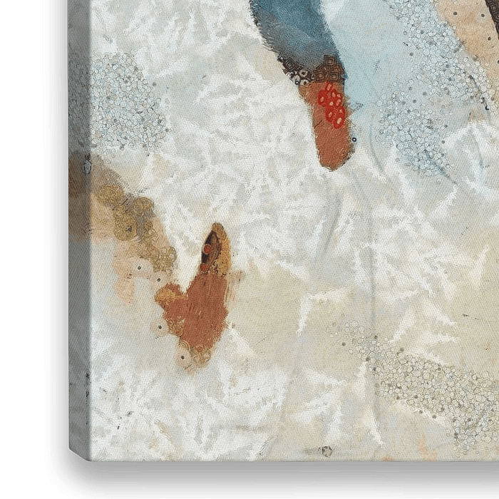 Abstraktes farbenfrohes Fantasiegemälde mit Kranichen. Mischtechnik im Stil der Gustav-Klimt-Malerei auf grober Leinwand.