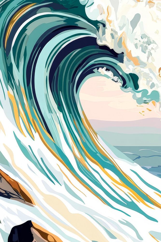 Ein kraftvoller Ozean bricht sich mit dynamischen Wellen und strahlenden Farben, die an eine warme Sommerbrise erinnern. Die Bewegungen der Wellen und die kräftigen Felsen versprühen Energie und Lebensfreude. Dieses Kunstwerk eignet sich hervorragend für das Wohnzimmer, wo es Regel für Entspannung und Inspiration sorgt.