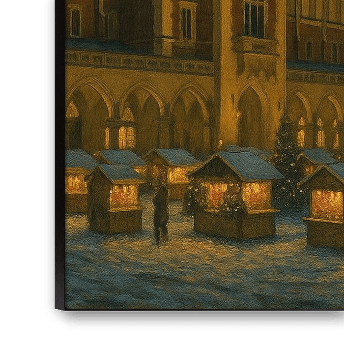 Dieses stimmungsvolle Gemälde versetzt den Betrachter auf den Weihnachtsmarkt von Krakau, der sich unter den gotischen Türmen der Marienkirche und den eleganten Bögen der Tuchhalle entfaltet. Der Platz ist mit Schnee bedeckt und leuchtet sanft unter dem Abendhimmel. Die hölzernen Stände strahlen goldenes Licht aus und bilden kleine Inseln der Wärme, die einen schönen Kontrast zu den kühlen Blautönen der Dämmerung bilden. Im Vordergrund fährt leise eine Pferdekutsche vorbei, die der winterlichen Szene einen zeitlosen Hauch von Nostalgie verleiht.