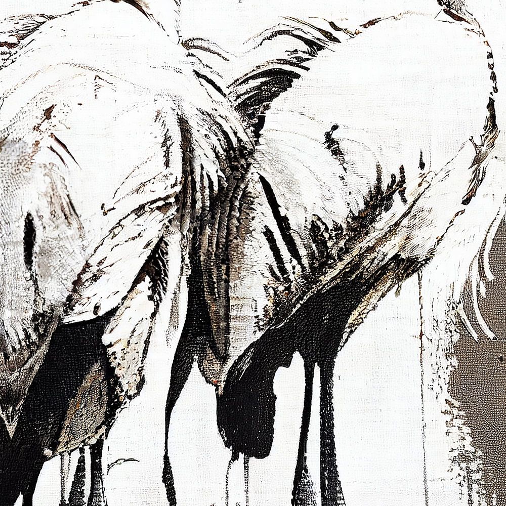 Bild von zwei Kranichen auf Leinen. Das Weiß des Vogels geht in die weiße Fläche hinter ihm über. Passend zu verschiedenen Trends, wie Beige und Organic.