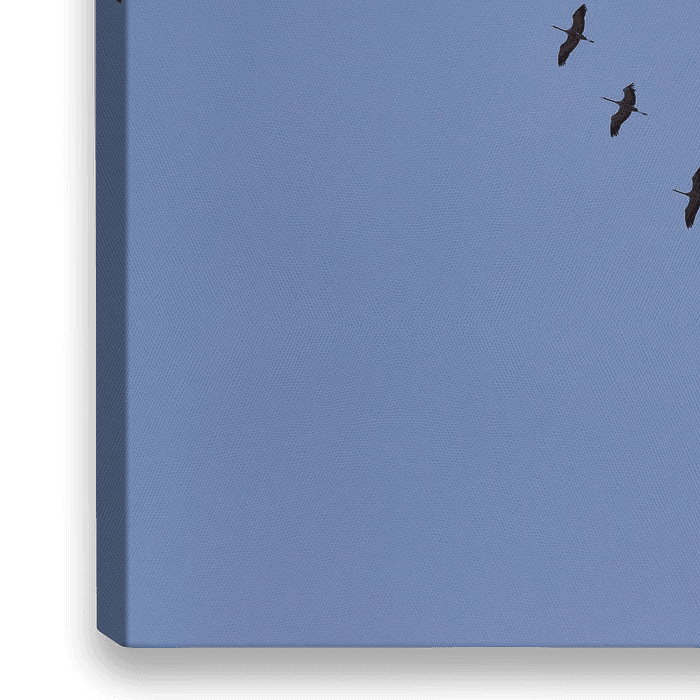 Ein Bild von Kranichen, die in Formation fliegen. Die Silhouetten der fliegenden Vögel heben sich gegen den blauen Himmel mit Vollmond ab. Sie fliegen nach Norden und kündigen den Frühling an.