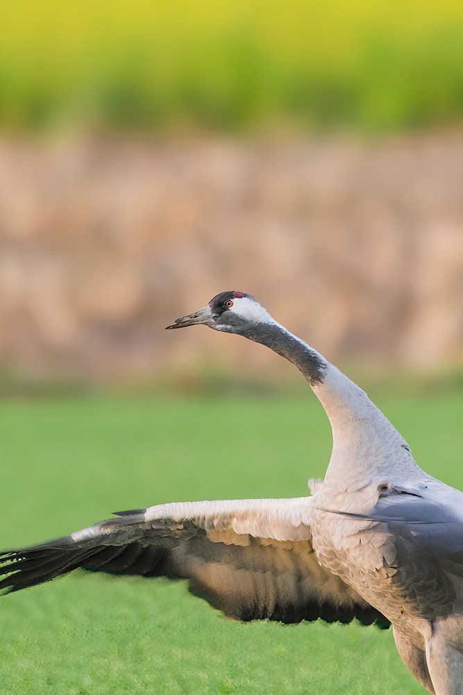 Der Kranich oder Eurasische Kranich (Grus Grus) tanzt während des Herbstzuges auf einem Feld bei Diepholz in Deutschland. Die Kraniche fressen und rasten auf den Feldern rund um die niedersächsischen Moore während ihrer Wanderung von den Brutgebieten in Norddeutschland, Polen und Skandinavien zu ihren Winterquartieren in Spanien und Nordafrika.