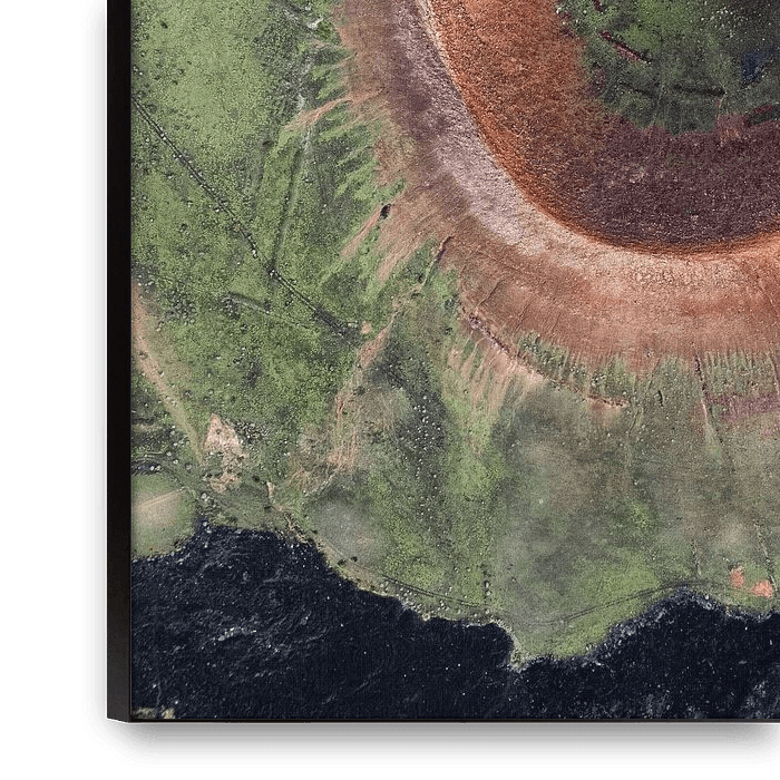 Ein großer Krater auf Lanzarote bildet eine abstrakte Mondlandschaft. Der schwarze Lavastrom zeigt die Überreste der vulkanischen Aktivität.