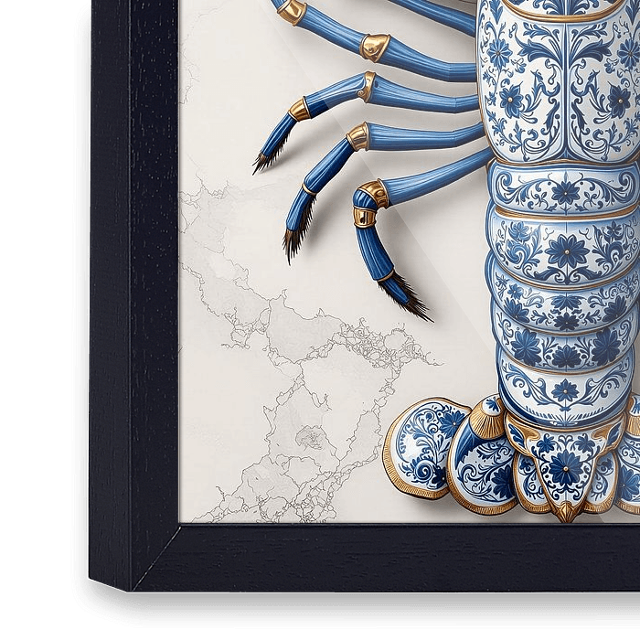 Schöner Hummer mit Delfter Muster von oben gesehen auf einem passenden Hintergrund. Dieses Stück passt perfekt in eine Gourmetküche oder ein Wohnzimmer.