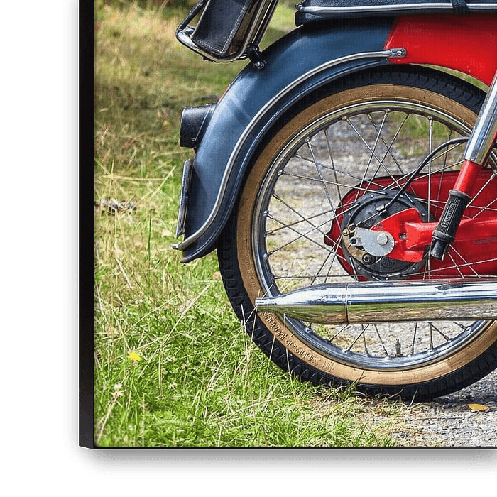 Heute sind diese seltenen Maschinen wieder heiß begehrt und Freiheitsgefühle der Jugend überkommen den Betrachter. Man fühlt sich zurückversetzt in Zeit in der man 16 oder 17 Jahre alt war. Eine kunstvolle Fotografie nicht nur für Motorrad Oldtimer-Liebhaber, dass Sie überall aufhängen können.