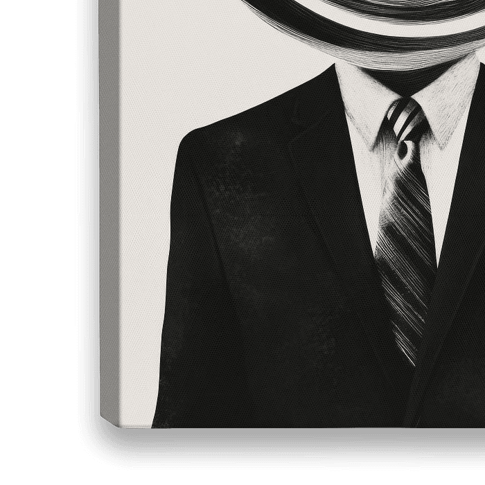 Ein geheimnisvoller Schatten in einem eleganten Anzug, dessen Kopf aus hypnotisierenden, spiralförmigen Linien besteht, zieht den Betrachter in seinen Bann. Der Kontrast zwischen der formellen Kleidung und dem surrealen Kopf kreiert eine faszinierende Verbindung zwischen Realität und Illusion, die Fragen zur Identität und Wahrnehmung…