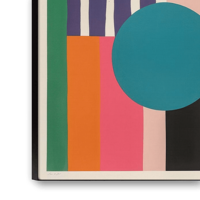 Ein lebendiges abstraktes Kunstwerk, das mit geometrischen Formen und kräftigen Farben spielt. Im Zentrum steht ein großes türkisfarbenes Rund, umgeben von vertikalen Streifen in Blau, Lila, Pink und Orange. Rechts fügt ein gelber Bereich mit weißem Kreis Kontrast hinzu, während darunter Pink und ein schwarzes Rechteck Balance und Tiefe erzeugen. Auf cremefarbenem Hintergrund entsteht eine harmonische, dynamische Komposition, die Bewegung, Struktur und Farbharmonie vereint – modern, klar und visuell fesselnd.