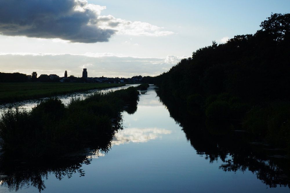 Wolk met tegenlicht en reflectie bij Moordrecht, Krimpenerwaard, Zuid-Holland.