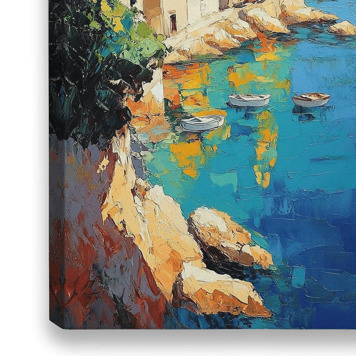 Kroatien Kunst - Dieses Landschaftsgemälde zeigt eine lebendige und farbenfrohe Darstellung eines malerischen Küstendorfs in Kroatien. Die markante Architektur und das spiegelnde Wasser fangen die heitere Atmosphäre der Adriaküste ein.