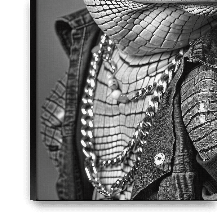 Ein Porträt eines Krokodils, gekleidet in einer stylishen Jeansjacke, Cowboyhut und Sonnenbrille, ausgestattet mit einer Kette, in Schwarzweiß.