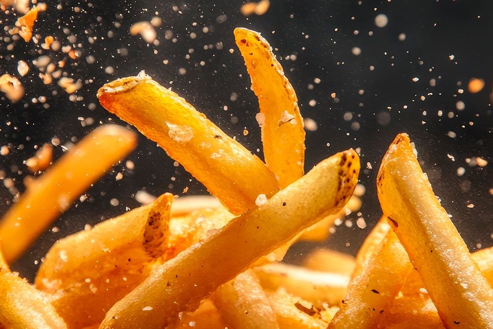Goldbraune Pommes frites scheinen durch den Raum zu fliegen, umgeben von einem aufregenden Staub aus knusprigen Bruchstücken. Ihre verführerische Textur und die lebendige Farbe wecken den Appetit und sorgen für eine gesellige Atmosphäre. Perfekt für eine Küche oder ein belebtes Esszimmer, wo die Liebe zum Essen im Mittelpunkt steht.