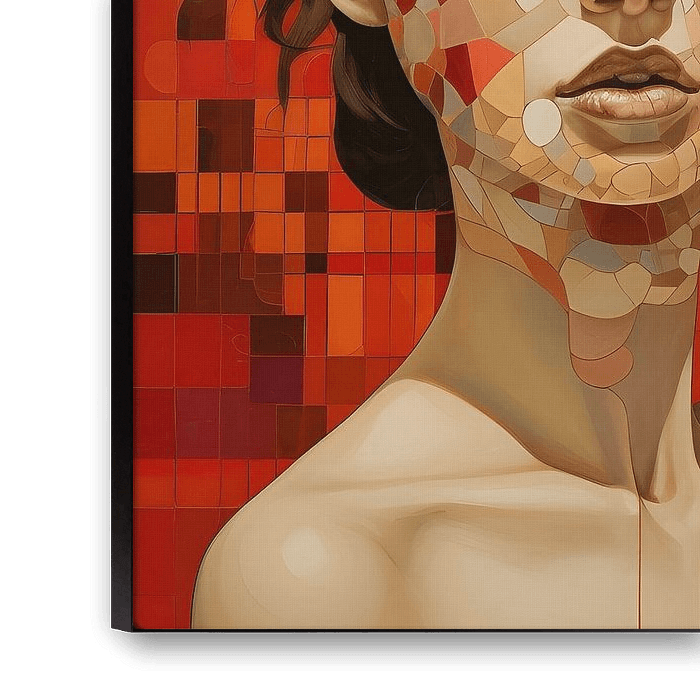 Die Arbeit zeigt ein Trio von Gesichtern, jedes in einem Mosaik von Farben, mit scharfen Winkeln und sanften Kurven, die in einer Harmonie der Form zusammen existieren. Es fordert den Betrachter heraus, zu entschlüsseln, wo ein Gesicht endet und ein anderes beginnt. Die warme Farbpalette aus Orangerot und Creme erinnert an einen leuchtenden Sonnenuntergang. Dieses Triptychon erforscht die facettenreiche Natur der menschlichen Identität, bei der jeder Winkel eine neue Perspektive und einen neuen Einblick in die Seele bietet.