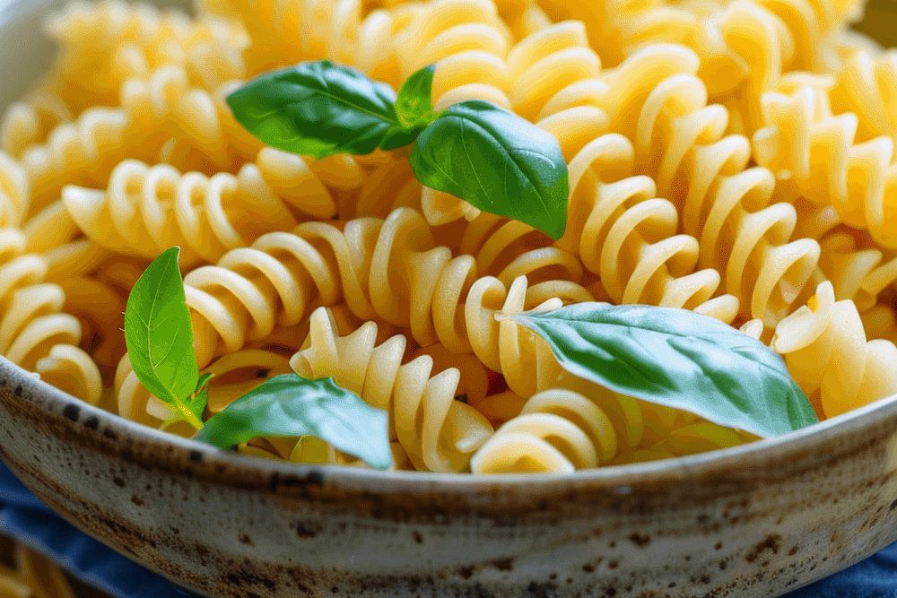 Eine Schale voller al dente gekochter Fusilli-Nudeln, garniert mit frischem Basilikum. Diese klassische italienische Pasta ist bereit für Ihre Lieblingssauce oder einfach mit Olivenöl und Gewürzen serviert.