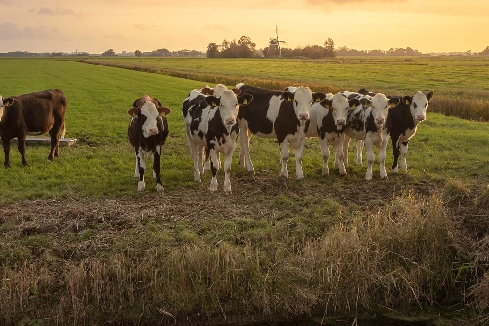 Foto von Kühen auf dem Land, die sich im Wasser des Wassergrabens spiegeln. Im Hintergrund ist eine Windmühle zu sehen, die von der untergehenden Sonne beleuchtet wird.