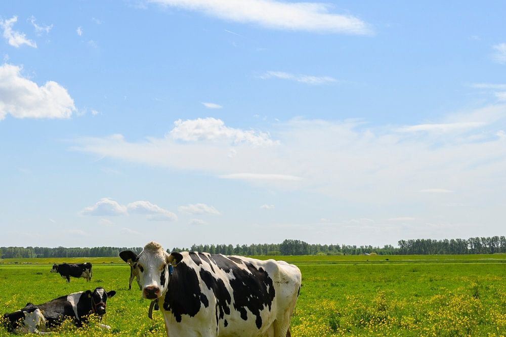 Kühe auf einer Wiese mit frischem, grünem Gras und Hahnenfuß-Wildblumen im Frühling im IJsseldelta bei Kampen in Overijssel, Niederlande.