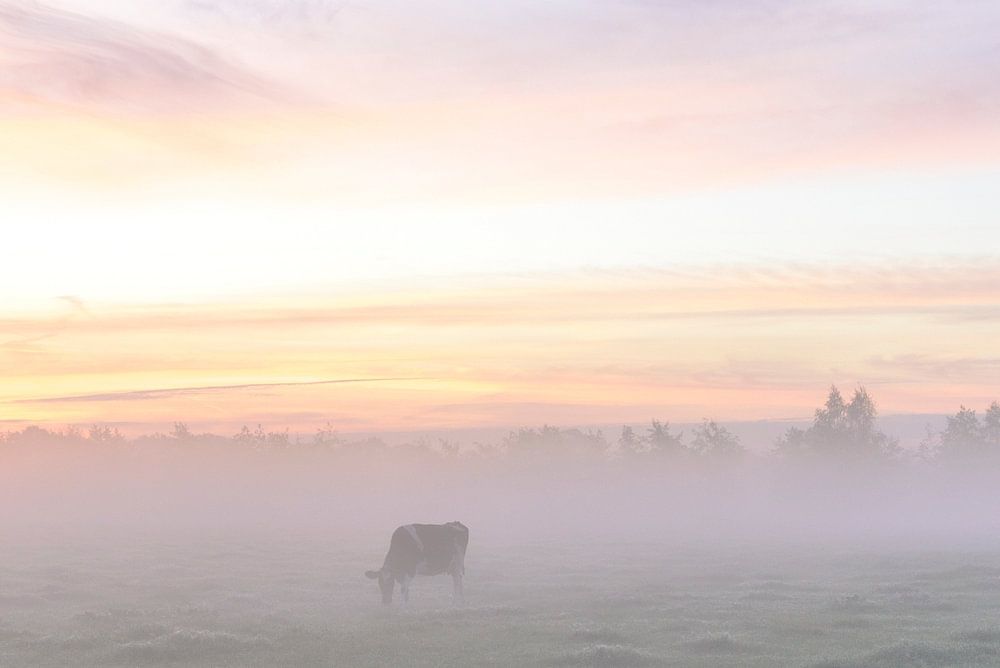 Atmosphärisches Bild von Kühen im Nebel an einem frühen Herbstmorgen. Kühe grasen gerne auf einer Wiese in Friesland. Mit ein wenig Bodennebel am frühen Morgen ist es wirklich angenehm!