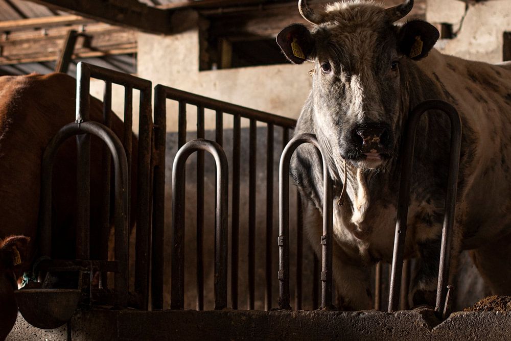 Das letzte Fettarschgesäß in einem alten Stall. Ein Landwirt, der sich um eine Reihe von Bullen kümmerte. Diese neugierigen Tiere behielten alles genau im Auge.
