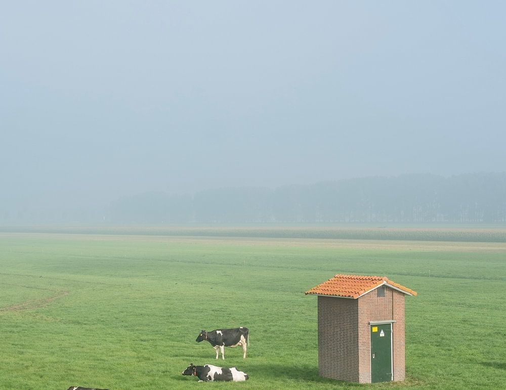 nebliger morgen in der nähe der rheinauen in der provinz utrecht mit schwarz-weißen kühen auf einer grünen wiese in der nähe eines kleinen hauses mit rotem ziegeldach, das eine leicht surrealistische atmosphäre erzeugt. Fotografiert von dem höheren Deich entlang des Rheins zwischen Wijk bij Duurstede und Amerongen an einem Morgen im September.