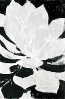 Ein kontrastreiches Gemälde einer Lotusblume mit dicken, gestischen weißen Pinselstrichen vor einem tiefschwarzen Hintergrund. Die Blütenblätter sind weitläufig und strukturiert und vermitteln ein Gefühl dramatischer Leuchtkraft.