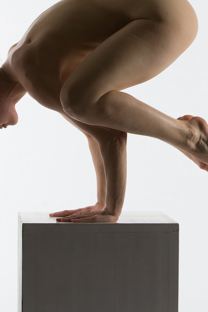 Künstlerische nackte Yogahaltung auf einem Kasten