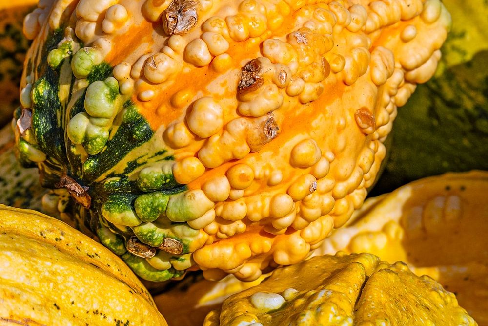 Eine Fülle bunter, geformter Kürbisse und Zierfrüchte liegt bereit und feiert mit ihren leuchtenden Orange-, Weiß- und Grüntönen die reiche Erntezeit.