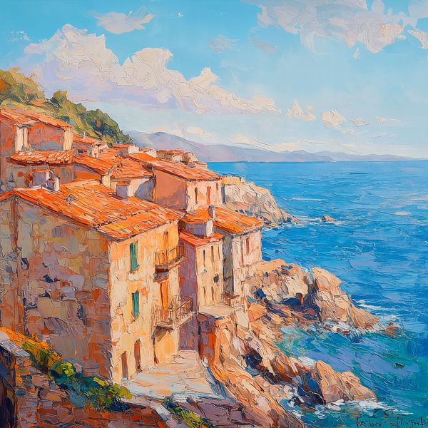 Ein malerisches Küstendorf schmiegt sich an die Felsen, während die Sonne sanft den Himmel mit warmen Farben küsst. Die roten Ziegeldächer der Häuser kontrastieren harmonisch mit dem strahlenden Blau des Meeres und der sanften Brise. Wolken tanzen über der Landschaft, die ruhige Szene strahlt eine zeitlose Schönheit aus.