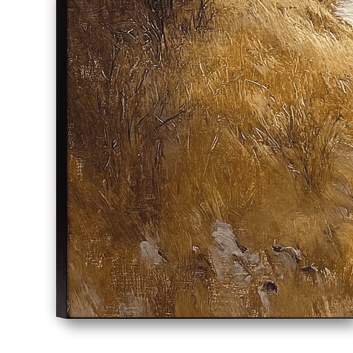 Ein einsamer Pfad schlängelt sich durch goldene Dünen zum tosenden Meer. Verwitterte Küstenhäuser mit roten Dächern trotzen dem nahenden Sturm – eine Szene voller Melancholie, Naturkraft und nordischer Ruhe. Dieses stimmungsvolle Bild im realistisch-romantischen Stil fängt den Zauber des Übergangs zwischen Herbst und Winter ein – wild, rau und wunderschön.