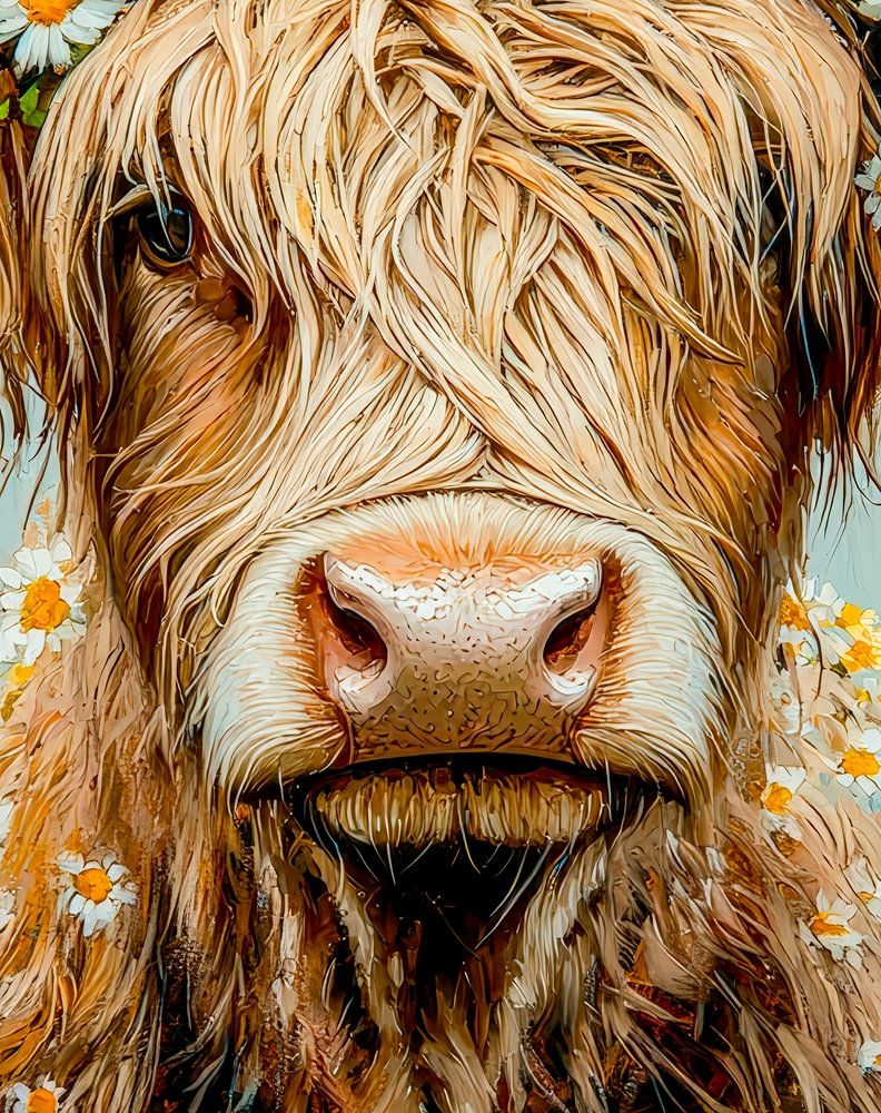 Dieses kunstvolle Porträt zeigt eine majestätische Kuh mit sanftem, cremefarbenem Fell, das in feinen Wellen über Stirn und Hals fällt. Ihr Gesicht strahlt eine tiefe Ruhe aus, während ihre dunklen Augen von einer geheimnisvollen Sanftheit durchzogen sind. Mit ihrem detailreich ausgearbeiteten, fließenden Fell wirkt sie fast wie eine Verkörperung der Natur selbst.