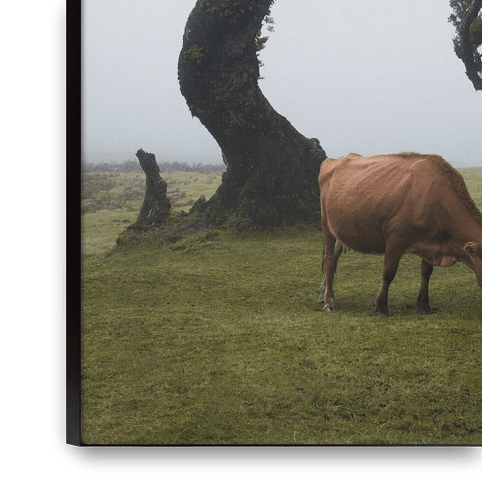 Bestelle dieses Landschafts-Wandbild Kuh auf Madeira im Wald von Fanal bei Nebel von Jens Seßler als Reproduktion auf Leinwand, Alu-Dibond, als Poster, Fototapete oder Acrylglasbild.