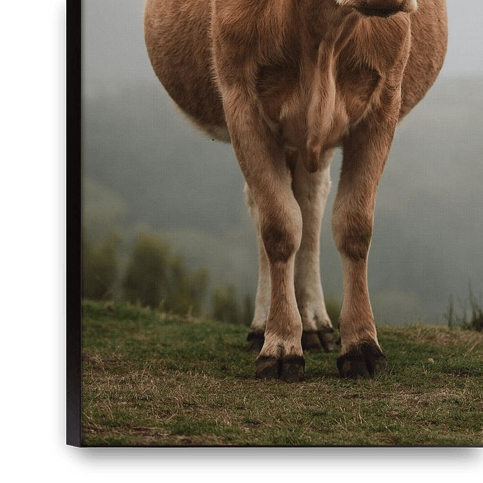 Dieses Kunstwerk zeigt eine hellbraune Kuh, die ruhig in einer nebligen Landschaft steht. Das sanfte Farbspektrum – die warmen Brauntöne der Kuh und das weiche Grau des Nebels – verleiht dem Bild eine friedliche Atmosphäre. Die natürliche Umgebung, mit den vage sichtbaren grünen Hügeln im Hintergrund, verleiht der Fotografie eine…