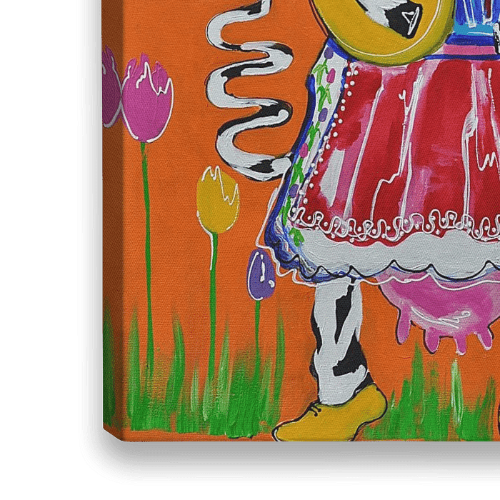 Bestelle dieses Kuh-Wandbild Kuhe und kase aus den Niederlanden 't "Koe kaasmeisje " von Kunstenares Mir M. Kolkman van der Klip als Reproduktion auf Leinwand, Alu-Dibond, als Poster, Fototapete oder Acrylglasbild.