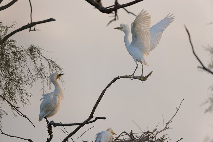 Kuhreiher (Ardea ibis) streiten um den besten Platz auf dem Schlafbaum in den Sümpfen der Carmargue in Südfrankreich.