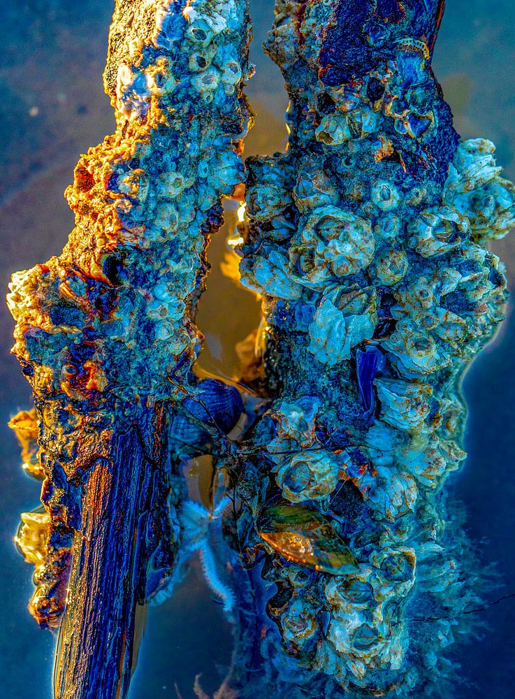 Ihre exotischen "Mäntel", die mit Schnecken, Seepocken, Seesternen und anderen Meeresbewohnern bewachsen sind, erzählen eine Geschichte von Zeit und Wandel. Im Licht der goldenen Stunde entsteht eine geheimnisvolle Atmosphäre, die an die innige Umarmung in Gustav Klimts Der Kuss erinnert.