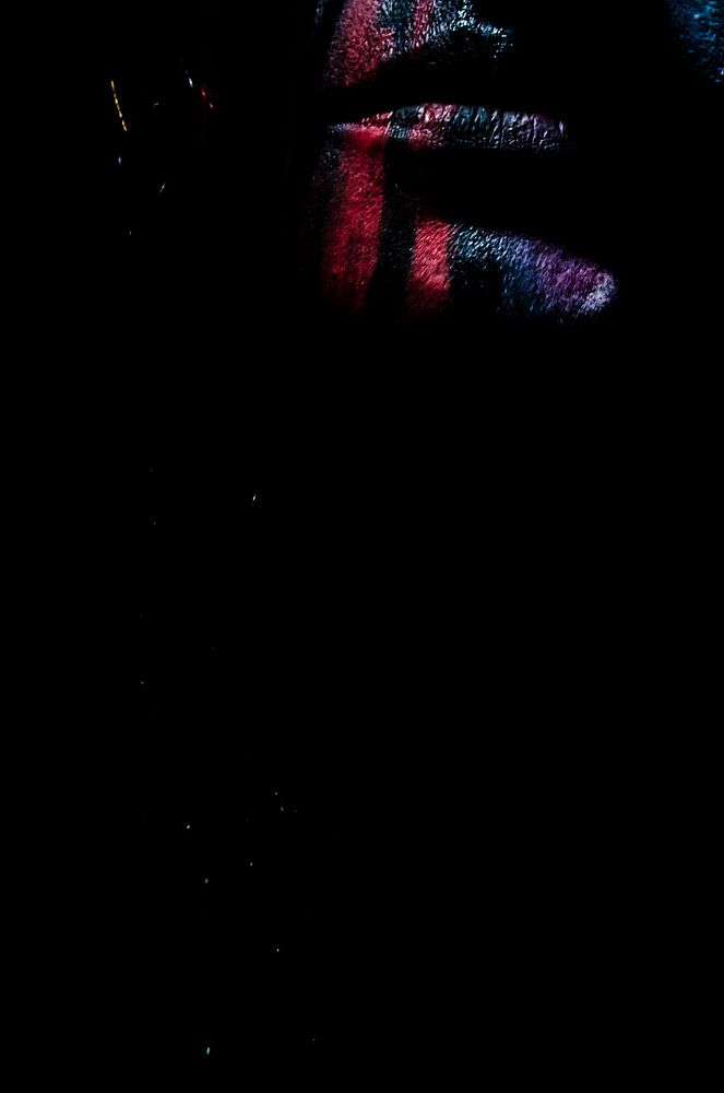 Dieses Bild zeigt einen Mann mit einem intensiven und ausdrucksstarken Gesichtsausdruck, der teilweise in Dunkelheit gehüllt ist. Sein Gesicht ist bunt bemalt, wobei Blau- und Rottöne durch den starken Kontrast der Beleuchtung dramatisch aufleuchten. Die Beleuchtung erzeugt einen geheimnisvollen und fast dramatischen Effekt, da nur ein Teil des Gesichts sichtbar ist, während der Rest im Schatten verschwindet. Das Haar scheint nass oder feucht zu sein und fällt über einen Teil des Gesichts, was den rauen und emotionalen Look des Fotos noch verstärkt. Der dunkle Hintergrund und der Einsatz von Schatten verstärken den geheimnisvollen und kraftvollen Charakter des Bildes.