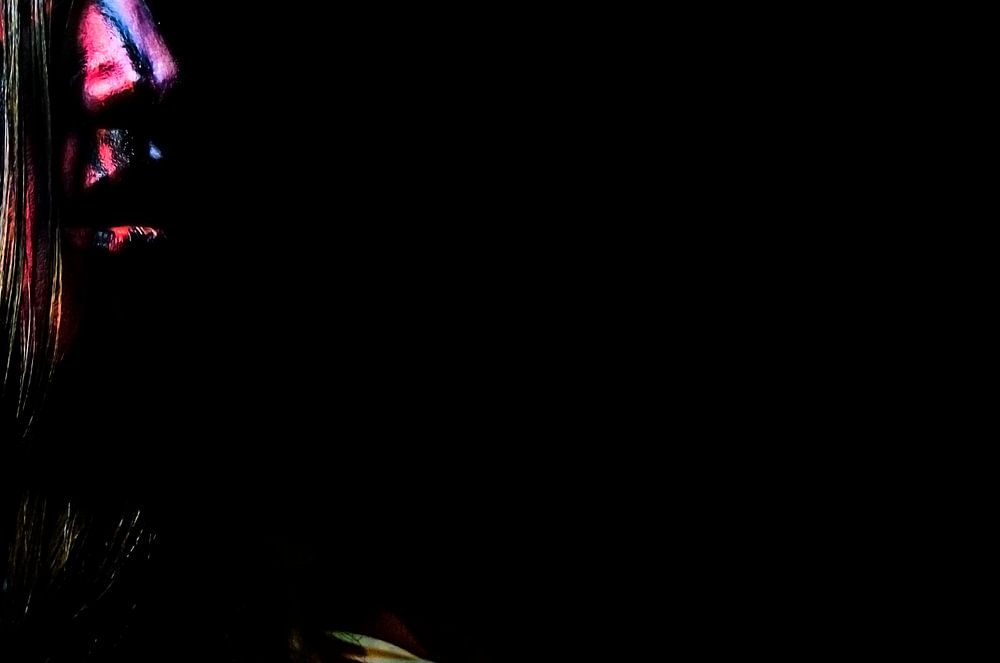 Dieses Bild zeigt eine in Dunkelheit gehüllte Person, von der nur Teile des Gesichts und des Körpers durch farbige Reflexionen beleuchtet werden. Die Kombination aus tiefen Schatten und hellen Rot-, Blau- und Gelbtönen auf dem Gesicht und der Kleidung ergibt einen dramatischen, fast abstrakten Effekt.