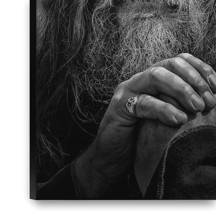 Dieses Schwarz-Weiß-Foto zeigt einen älteren Mann mit einem langen, wilden Bart und langem Haar. Er trägt eine Maske aus Moos und Naturmaterialien und eine Krone aus Blättern auf dem Kopf. Seine Hände sind gefaltet, als würde er beten oder in tiefer Kontemplation verharren. Die detaillierte Textur seines Gesichts, seines Bartes und…