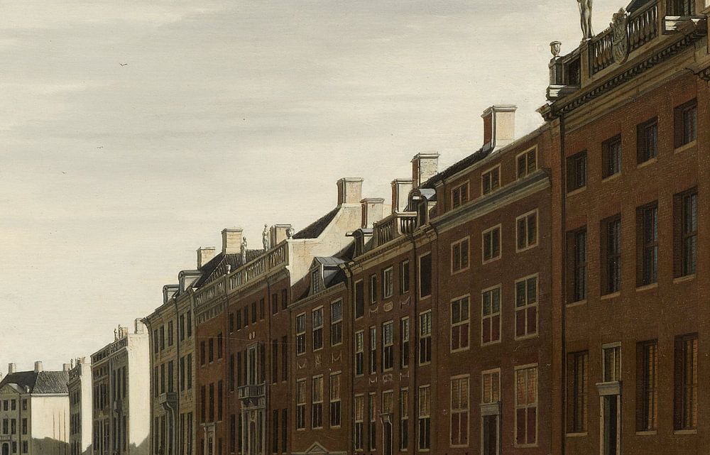 Das Stadtbild entwickelte sich erst nach 1650 als Genre, wobei Berckheyde einer der wichtigsten Spezialisten war. Hier nahm er den Neubau in der teuersten Biegung des Kanals mit mathematischer Präzision auf. Durch den Verzicht auf die junge Baumreihe, die tatsächlich am Kai stand, entsteht neben der topographischen Zuverlässigkeit ein zusätzlicher künstlerischer Effekt.