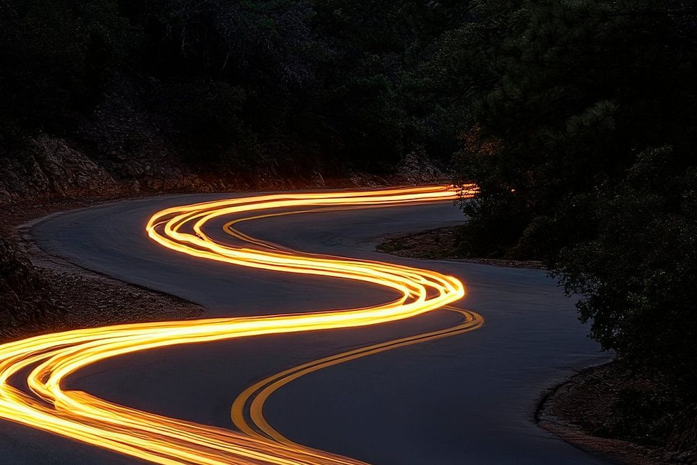 Sanfte Lichtspuren schlängeln sich elegant durch die Dunkelheit, als würde die Straße selbst einen geheimen Tanz vollführen. Die verschwommenen Gelb- und Orangetöne strahlen eine gemütliche Wärme aus und laden zum Träumen ein. Dieses bezaubernde Motiv eignet sich perfekt für das Wohnzimmer, um eine einladende und beruhigende Atmosphäre zu schaffen.