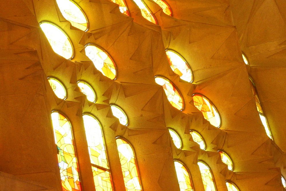 Das Sonnenlicht, das ab vier Uhr durch die Fenster der Basilika von Antoni Gaudi in fiel.