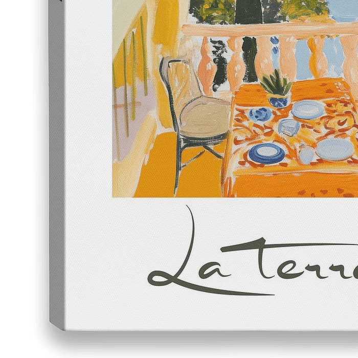 Ein Reiseplakat von „La terrasse“ im Stil von Henri Matisse, mit der Terrasse mit Blick auf die Croisette und das Mittelmeer, mit einem Tisch für die Teezeit in Matisse und Fauvist Farben.