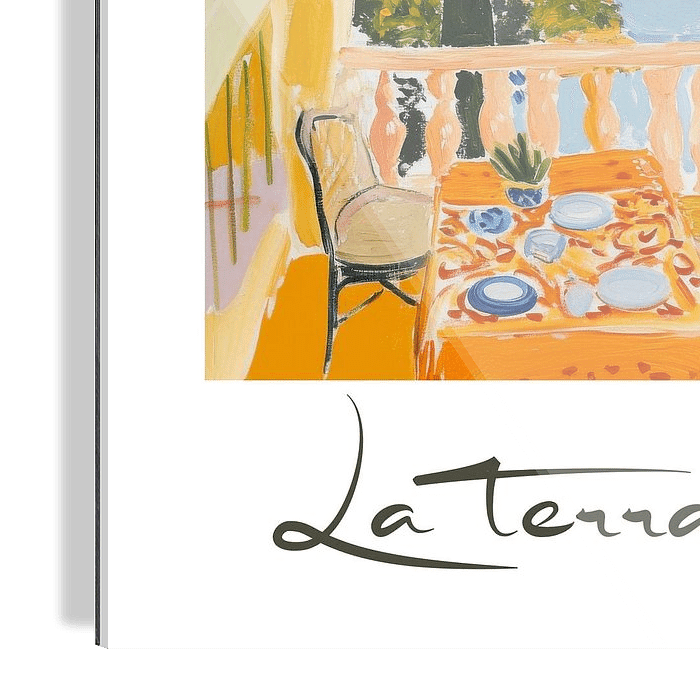 Ein Reiseplakat von „La terrasse“ im Stil von Henri Matisse, mit der Terrasse mit Blick auf die Croisette und das Mittelmeer, mit einem Tisch für die Teezeit in Matisse und Fauvist Farben.