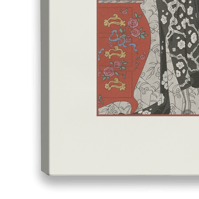 Ein historischer Modedruck mit einem modernen Twist: "La lettre et le feu". Inspiriert vom Art Deco, einer Stilrichtung, die in den 1920er Jahren entstand. Neuer geschäftsmäßiger Stil gemischt mit modernen klaren Linien und Farben.
