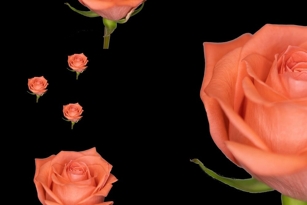 Große und kleine lachsfarbene Rosen auf schwarzem Hintergrund
