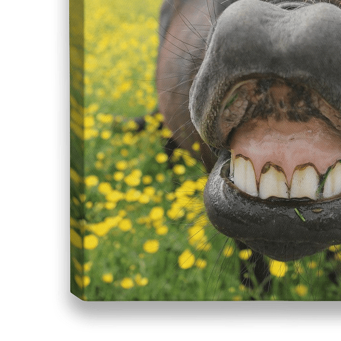 Eine Nahaufnahme des Mundes eines Ponys, das die Lippe hochhebt, um in einem Feld von Butterblumen einen Kuss zu geben.